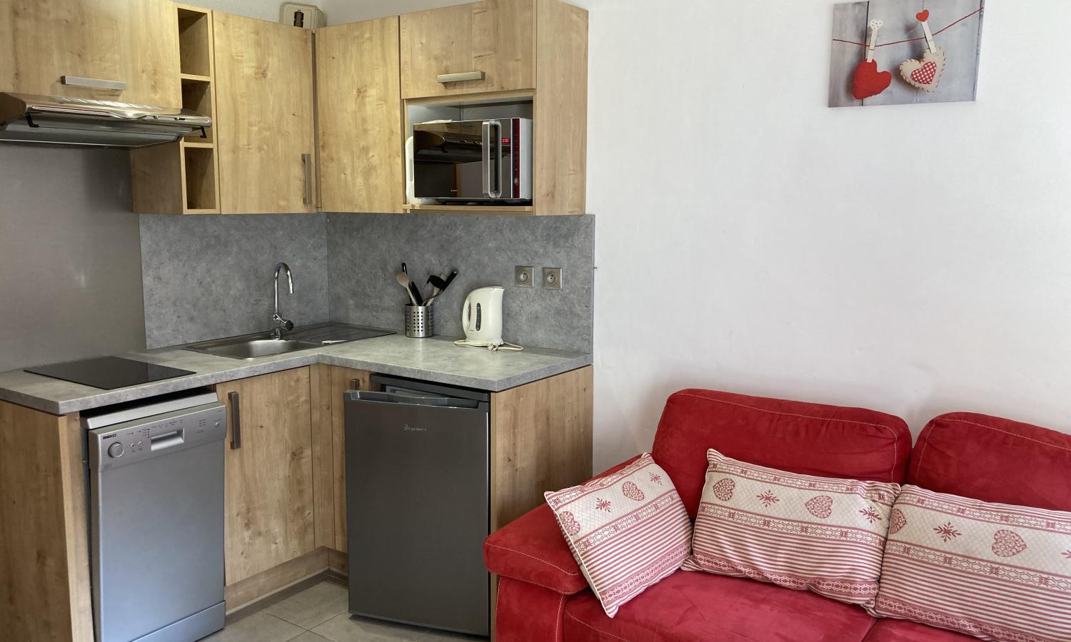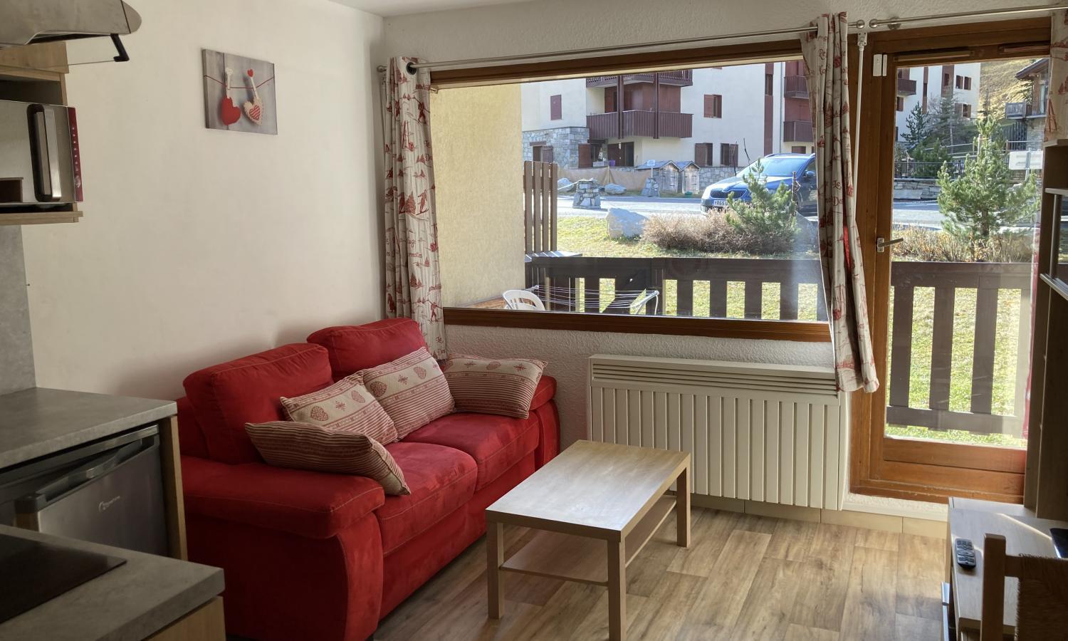 This is a really bright and sunny apartment in a great location which has just been refurbished with new kitchen and tasteful mountain décor. The apartment features a double bedroom and double sofa bed in the living room so it can sleep 4 people. The living/dining/ kitchen all benefit from the large window and door onto the south facing balcony which leads onto the communal gardens.