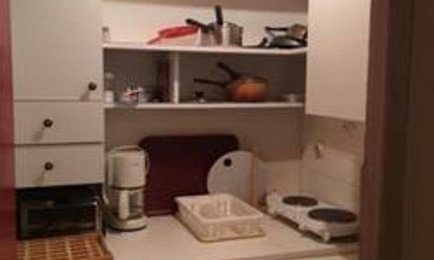 This cosy apartment was once two studio apartments which have been opened up so it has an interesting layout but is incredibly spacious for a one bedroom apartment in this location. There is a bedroom with double bed which opens with a sliding door onto the living room with single sofa bed and pull out bed for occasional guests. There is a compact kitchen with two ring hob, fridge, small oven, and coffee machine. Because the apartment was originally two it benefits from a shower room and a bathroom and has a good amount of storage. The apartment is on the ground floor of this popular residence with fantastic south facing views onto the Face de Bellevarde and up towards the Manchet Valley.