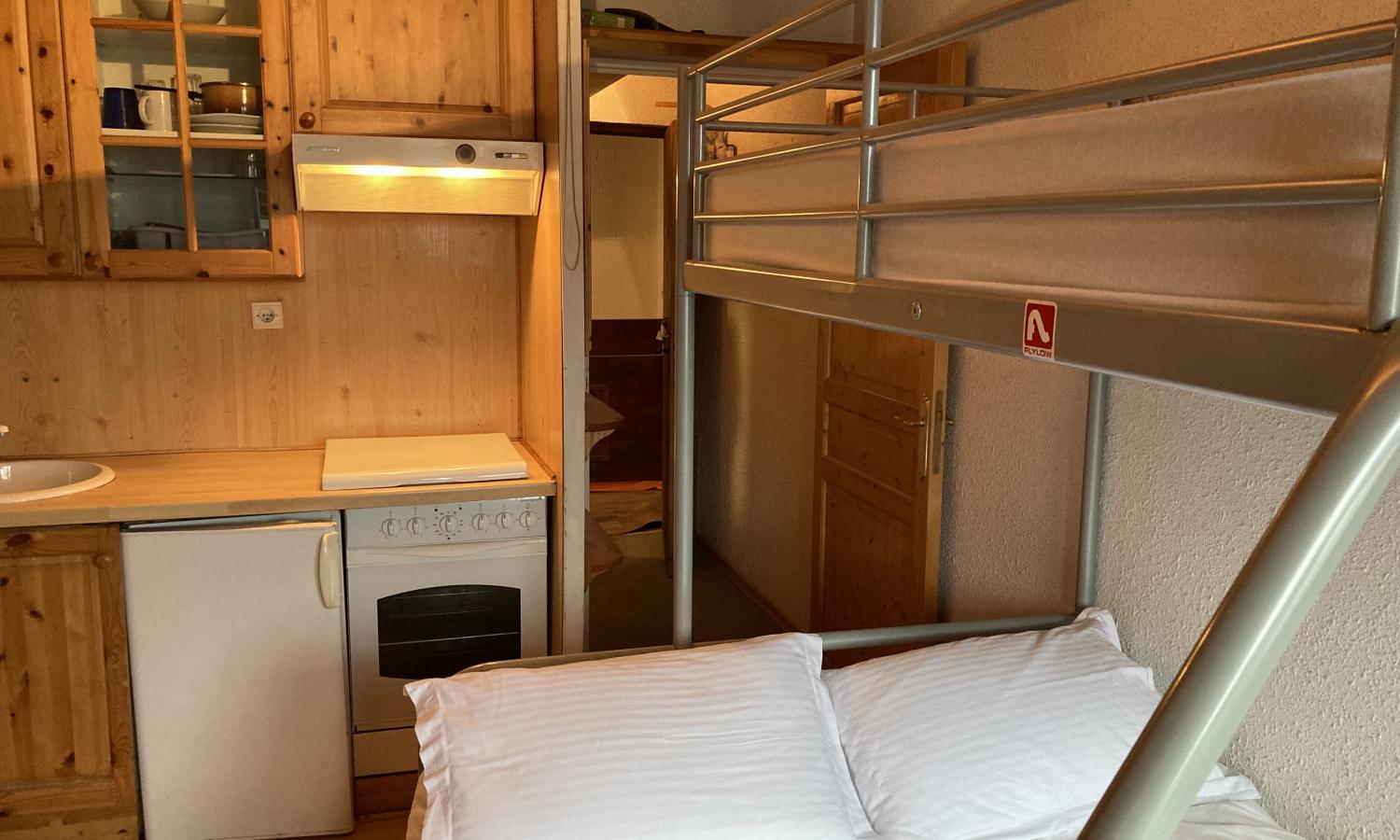 This sweet little studio has a bunk bed with a double bed below, a dining table seating 2 people, a fully equipped kitchenette with hob, fridge, oven and kettle and a good sized wardrobe. The compact bathroom has a bath and shower with wash basin and WC. This is a perfect apartment for a couple or single person for the winter.