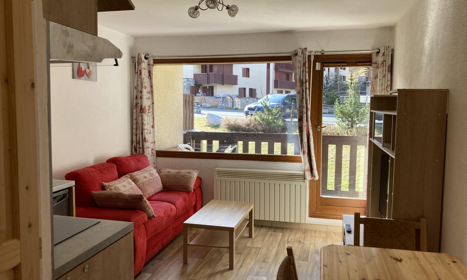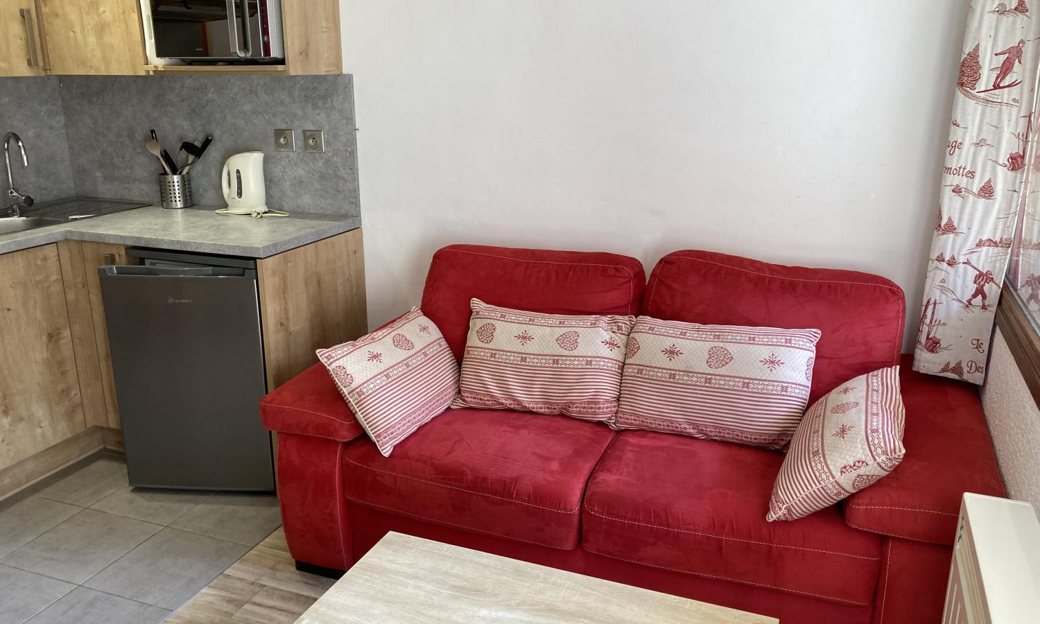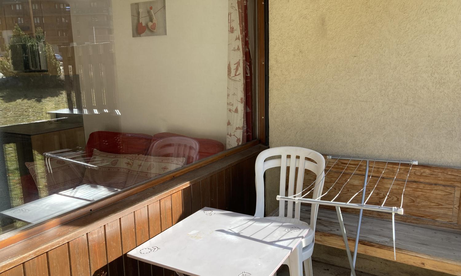 This is a really bright and sunny apartment in a great location which has just been refurbished with new kitchen and tasteful mountain décor. The apartment features a double bedroom and double sofa bed in the living room so it can sleep 4 people. The living/dining/ kitchen all benefit from the large window and door onto the south facing balcony which leads onto the communal gardens.