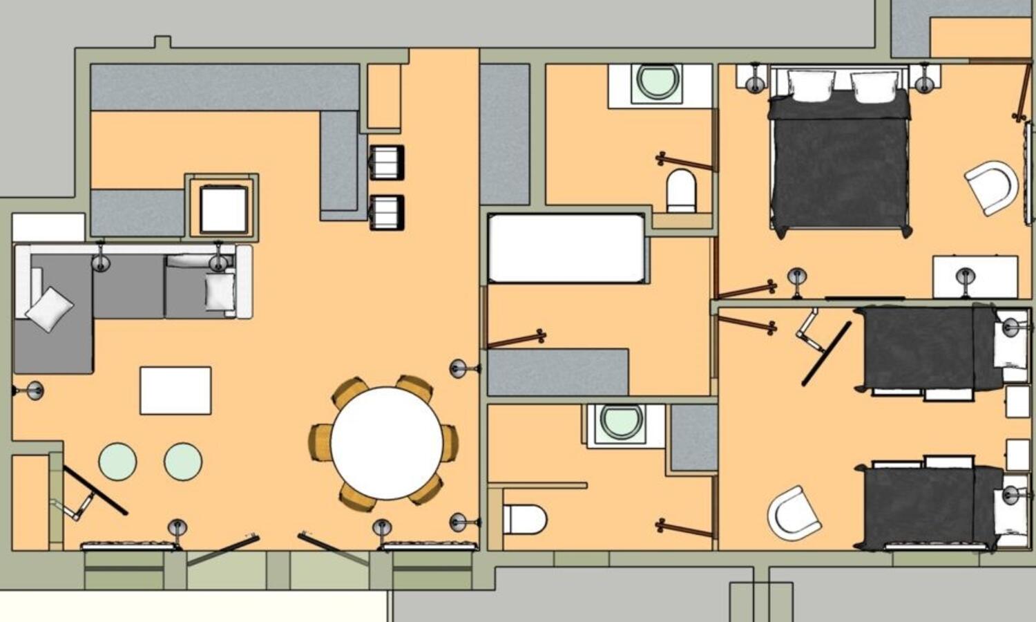 This exquisite modern apartment has been beautifully furnished with attention to detail and luxury in mind. The apartment has a spacious open plan living area with a large comfortable L-shaped sofa, TV and sonos and a stunning dining table seating 6 people. The fully equipped modern kitchen has a four ring hob, oven, microwave, fridge/freezer, washing machine, kettle and coffee machine with a breakfast bar with seating.