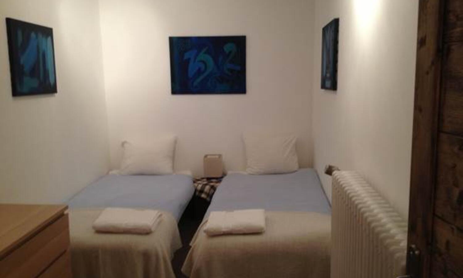 The apartment has a large open plan living/dining/kitchen with south and west facing windows which lead onto a wraparound balcony with enviable views from La Daille to the Manchet Valley. The sunny living area has a double sofa bed and comfortable seating which take in the extraordinary views. There is a television with UK channels and wifi throughout the apartment. There is a large dining table which can seat 6 and a fully equipped modern kitchen with a four ring hob, oven, microwave, fridge/freezer, dishwasher, coffee machine, kettle and toaster.